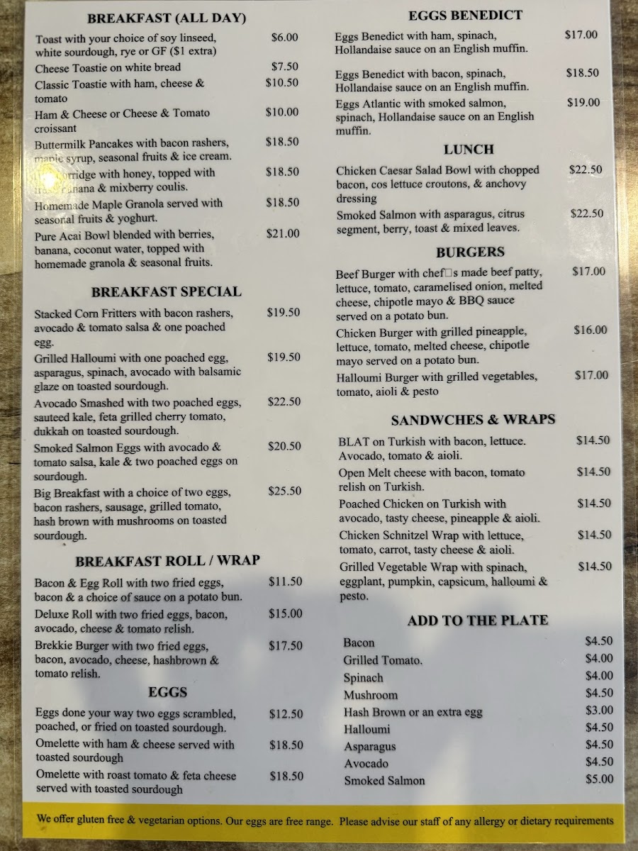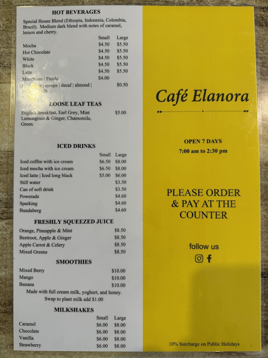 Welcome to Cafe Elanora, a hidden gem nestled in Elanora Heights, where the menu is a thoughtful blend of classic café offerings and fresh ingredients. Guests are invited to start their day with dishes like Eggs Done Your Way or a mouthwatering Omelette with ham and cheese, paired effortlessly with toasted sourdough. The iconic Eggs Benedict takes center stage, available with options such as smoked salmon or bacon, all draped in rich hollandaise.